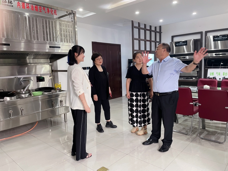 隨后,公司帶領協會領導們參觀了樣品間和展示廳。在展示廳內,市場總監何楊介紹了多環公司自主研發生產的7款“內循環油煙凈化機”專利產品,對每款產品的性能、應用場景都一一做了講解。參觀過程中,李基英副理事長和邵白秘書長與工作人員密切交流,詢問了解產品的特點,并由操作員現場演示爆炒辣椒、洋蔥,經多環公司生產的“內循環式油煙空氣凈化機”的處理,可做到不需要外接煙管直接采用吸排凈化一體的形式直接在室內就將烹飪中產生的油脂、煙顆粒物、異味、有害氣體及余熱進行了全部的凈化處理,機器排出來的就是干凈的空氣,在房間內完全聞不到辣味嗆味。協會領導看到眼前這一幕,當場對產品的性能贊不絕口。