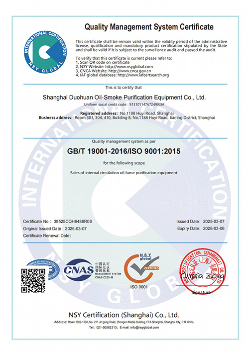 ISO9001認證 是全球公認的質量管理標準,它代表著國際社會對上海多環(huán)油煙凈化設備有限公司產(chǎn)品質量的認可,也標志著多環(huán)公司在規(guī)范化、標準化、國際化的道路上邁出了堅實的一步。